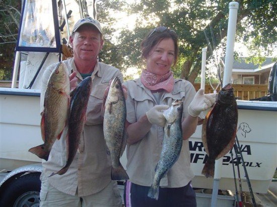 David & Marilyn from Charlotte, NC caught speckled trout, red drum, & flounder (grand slam) while fishing aboard Affordable Charters.